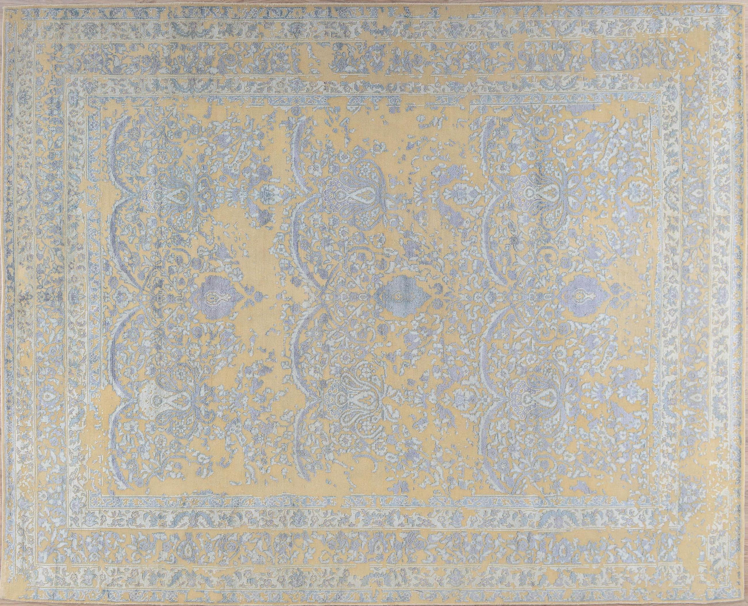 Этот ковер соткан из шелка и шерсти, с преобладанием шелкового ворса. Шерстяные участки рисунка пострижены очень коротко, из-за чего такую технику называют "Zero Pile", что в переводе означает нулевой ворс.