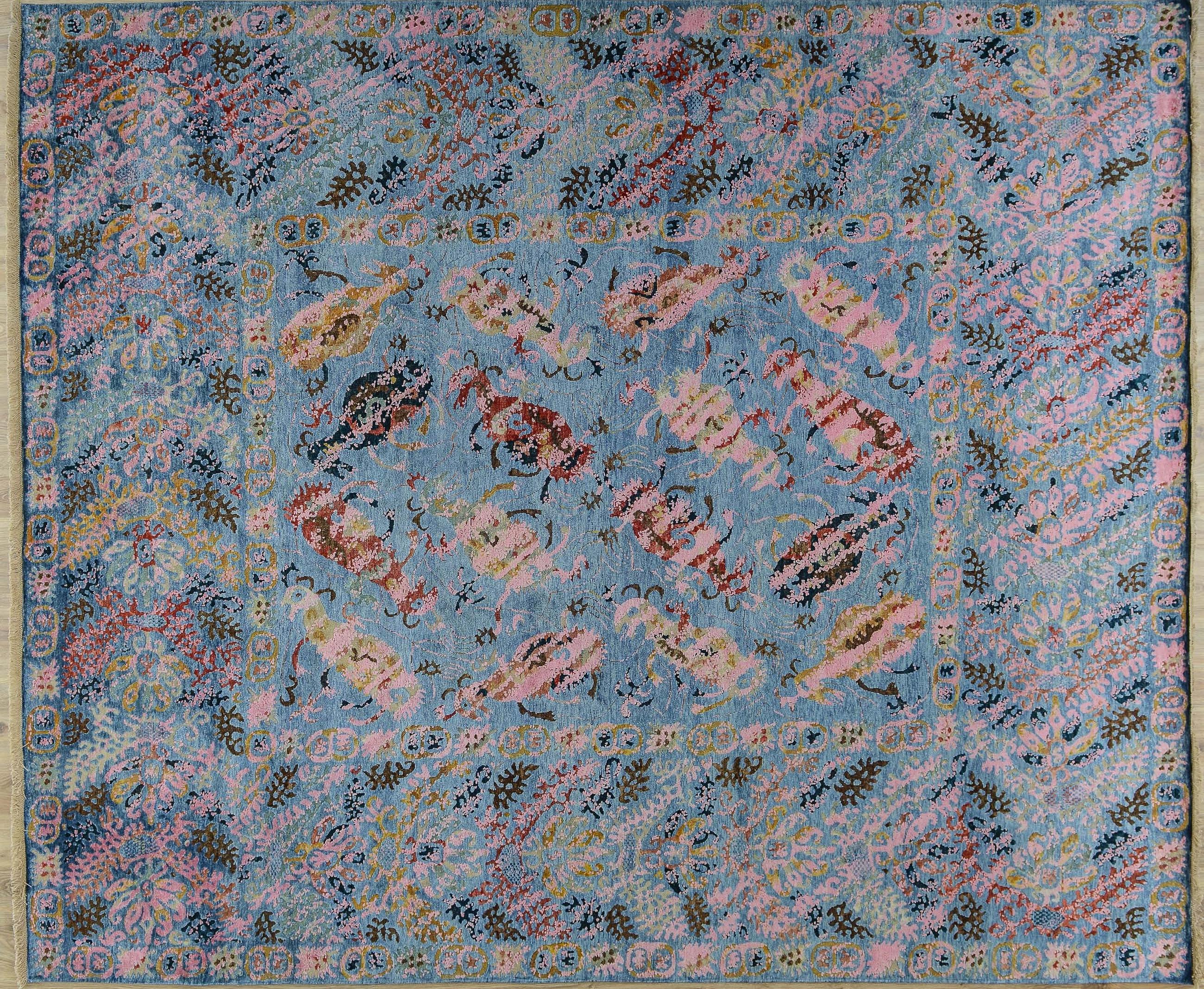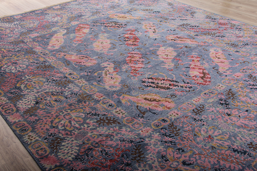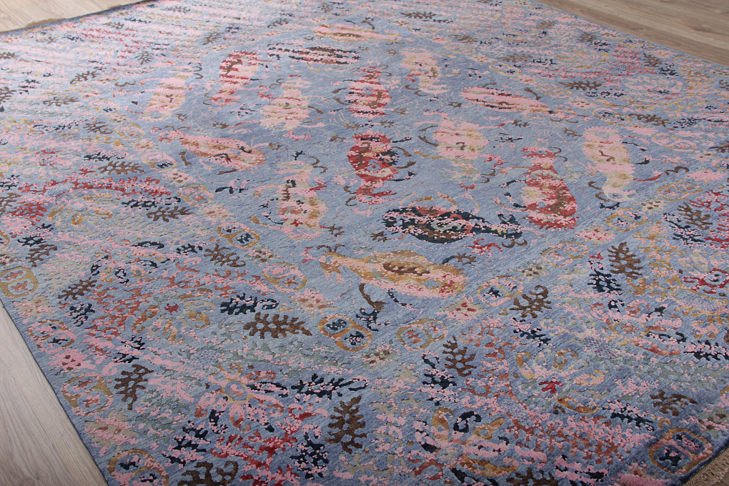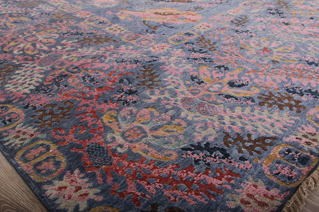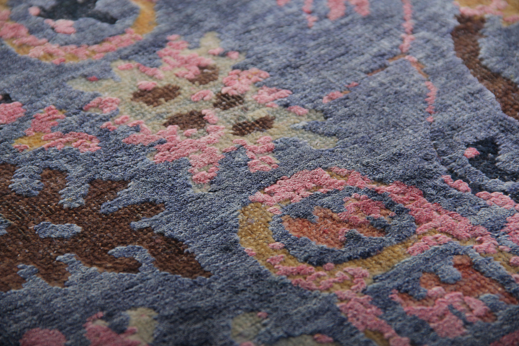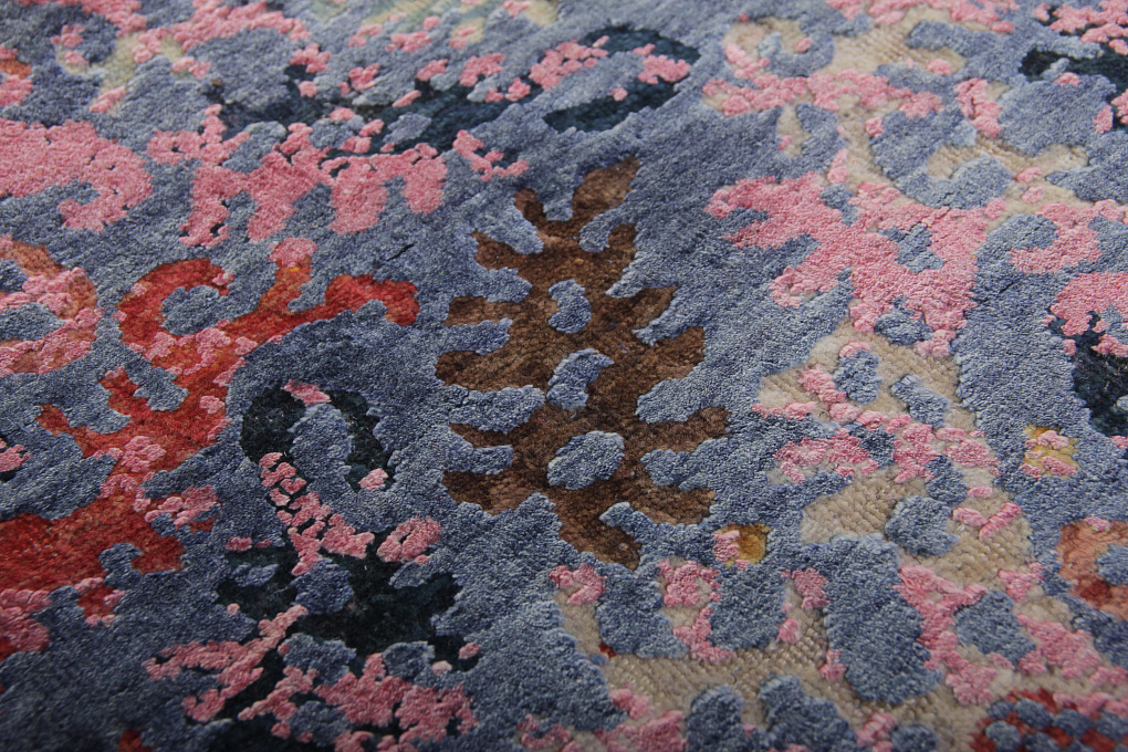 Этот ковер соткан из шелка и шерсти, с преобладанием шелкового ворса. Шерстяные участки рисунка пострижены очень коротко, из-за чего такую технику называют "Zero Pile", что в переводе означает нулевой ворс.